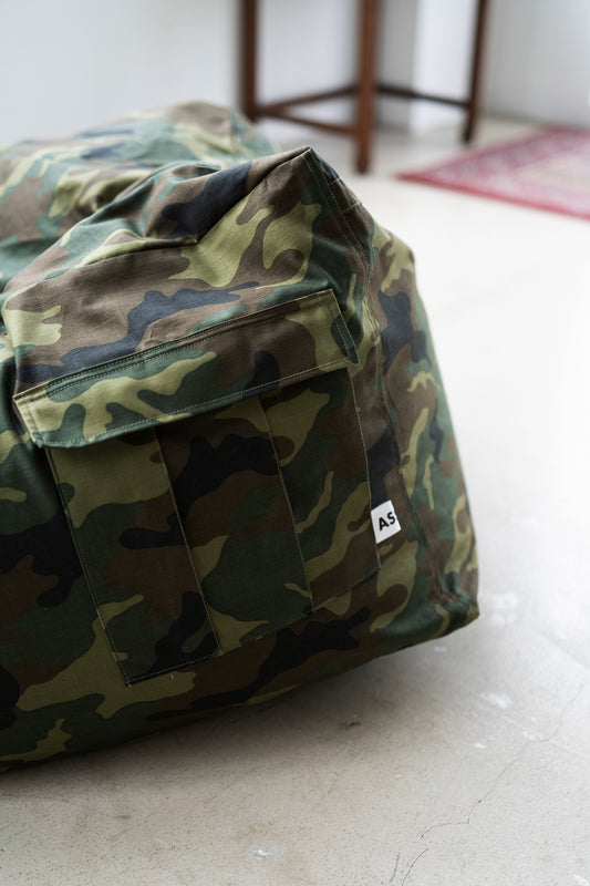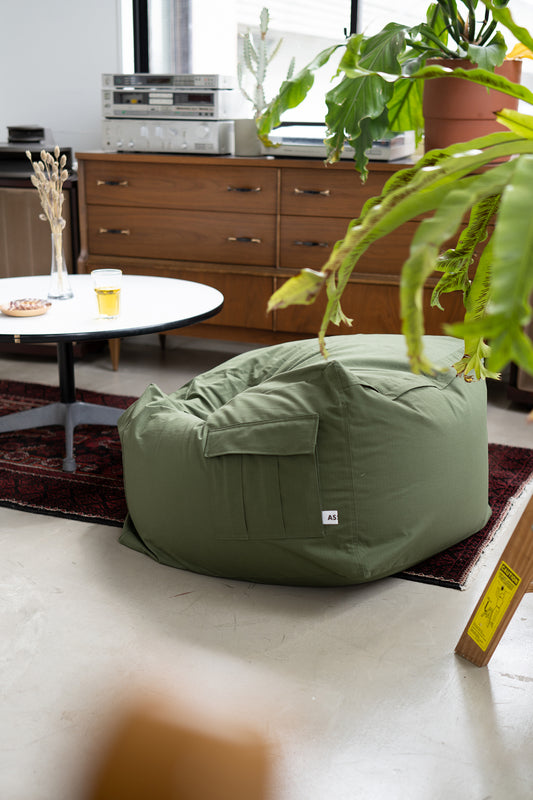 メインに使用している生地は、無印良品、ニトリのように伸びる素材ではありませんので、座った時の沈み込みは少ないです。私たちは、リアルなカーゴ感とプロダクトの美しさを優先してモノ作りしています。